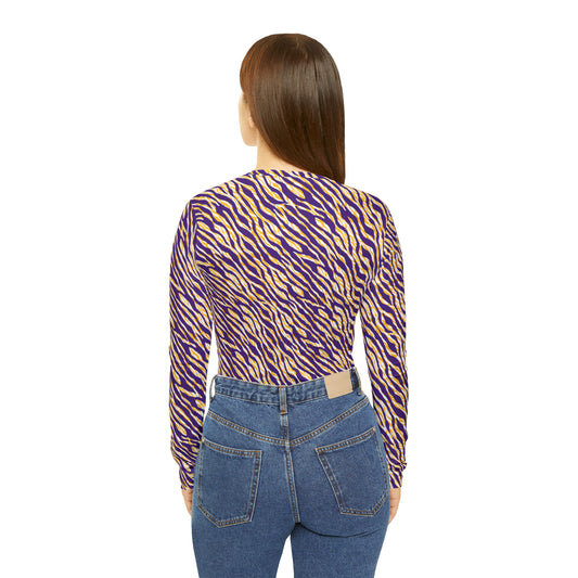 Women's Long Sleeve V-neck Shirt - Purple/Gold Zebra Print